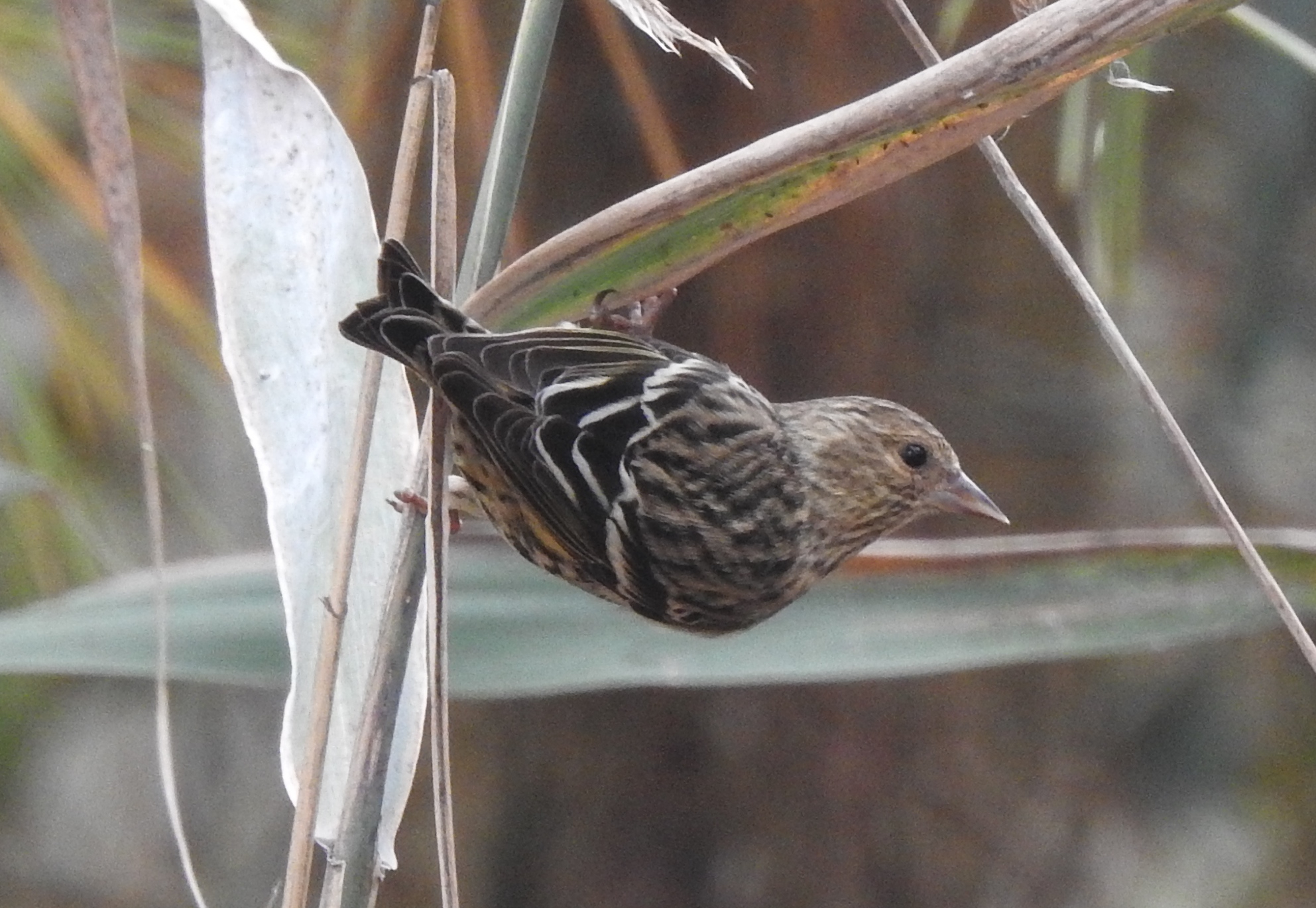 According to iNaturalist/Wikipedia, your "... small finch is an acrobatic feeder, often hanging upside-down like a tit." Your little bird and the Pine Siskin are Genus Spinus: Siskins and New World Goldfinches. I suppose we can consider them first cousins. The Cape Siskin I posted is a second cousin; it is Genus Crithagra: African Seedeaters, Serins, Canaries, and Citrils. Still a finch(ish), but apparently not as closely related.