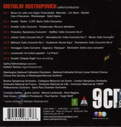 Which are in a way the least interesting CDs in this. The rest is all 20th century music, much of it written for Rostropovich himself, and much of it unknown to me. Among the composers completely new to my ears are Halffter, Hoddinott,  Moret,  Gagneux, Landowski, and Knaifel. And I don't think I have ever heard the Jolivet, Penderecki, Milhaud, Honegger, or Schedrin concertos before.