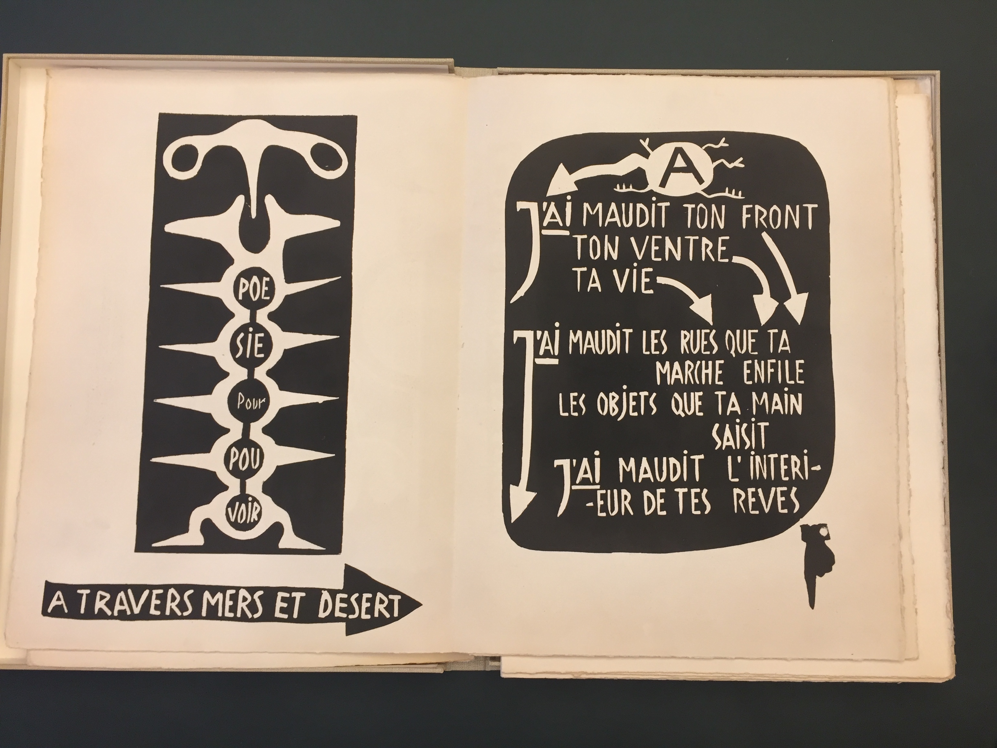 Michaux's poem had an intersting backstory. It was published as a "livre-objet" in 1949, with a drawing by the author as frontispiece, teak wood covers, and the text set as linocuts by Michel Tapié.