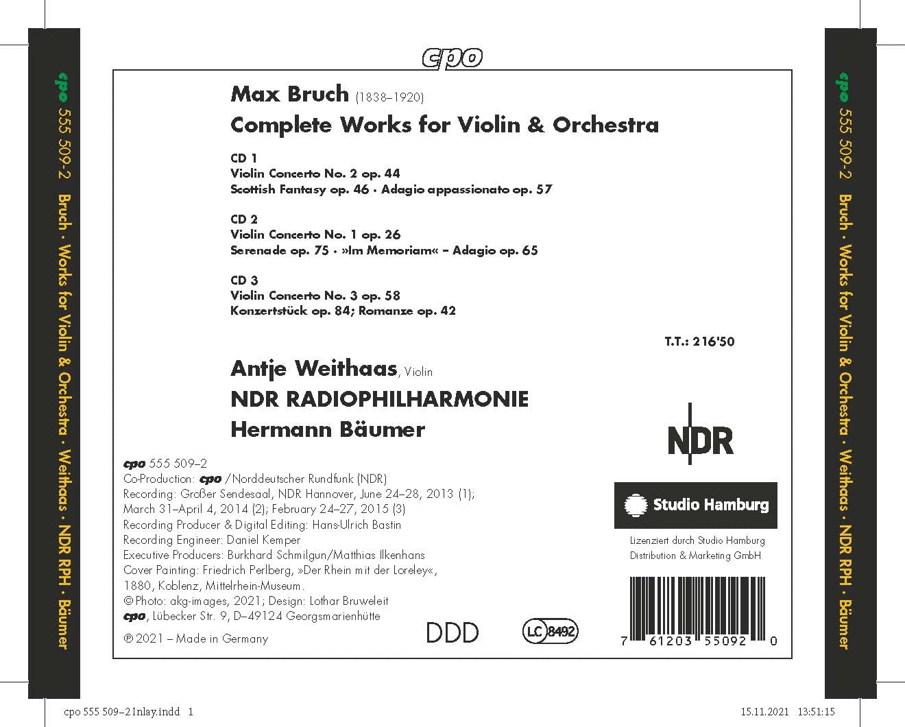 Bruch, Max (1838-1920) - Violin Orchestral Works, as shown below on 3 CDs in a CPO box as single jewel cases and complete booklets; new recordings from 2013-2015 w/ Antje Weithaas on violin and Hermann Bäumer/NDR Radiophilharmonie - new arrival in excellent modern sound and an orchestra to match the violinist; a criticism against the older recordings of Accardo w/ Masur which is in my collection - time to cull or not? These newer Weithaas performances have received excellent reviews (a little equivocating by Jerry Dubins?) which are attached for those interested.  Dave :)