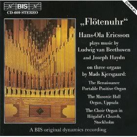Now we come to the works for Flötenuhr (Flute/Clock). This is the only modern recording floating around with all 32 works on it from Hob XIX. I would be delighted to give a more complete history of these pieces in another post, if asked, but suffice to say that Haydn combined original pieces with adaptations of some of his other works to make these pieces. Purists will say that only the original pieces should be counted, so they come up with a dozen or so. BUt I say "let 'em crash", I like the whole bunch. They are adapted for play on an organ since recreating the original instrument would be prohibitive. Some of them are in the Big Box, but I think not the entire group. BTW, there is some nice Beethoven on here too. :)