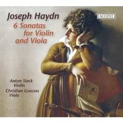 Finally, a disk of works that we have discussed before, but under different circumstances. That is the 6 duos of Hob VI. I have the version that was adapted for violin and cello, played by Duo Ongarese on Hungaroton. There, they have a certain somber air about them, and I really do like them. But I always wanted the original version for violin and viola, and figured to get it in the Big Box, since there are few versions running loose. Well, Brilliant leased a version, and wouldn't you know, it was the one I already have!  So when there was a discussion recently on the merits of Anton Steck's fiddling (in which he came out on top), and I discovered that he had recorded these works with the violist from Concentus Musicus Wien/Concerto Köln/Musica Antiqua Köln etc., it was a no brainer to shop for it. Well, I have to say, it sounds like 6 entirely different works! The viola is so much lighter than the cello, and the playing by both of these fellows is so light and wonderfully intimate that this is a can't miss enjoyment. Strongly recommend, even if you already have the other. Especially if you already have the other. :D