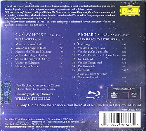 Well, I was listening to my Strauss collection (about a dozen or so CDs) and noticed on the previous page several posts of mine from two years ago that show the same recordings - the only change is the addition of the 2-disc DigiPack below, i.e. The Planets & Also Sprach Zarathustra performed by the Boston SO, Michael Steinberg conducting from 1970/71 - these were recorded w/ DG's quadraphonic technology at the time onto 4 tapes - the package contains a remastered CD and a BD Audio (24 bit, 192 kHz in 4.0 surround sound - details quoted below w/ much more at the link, if interested).