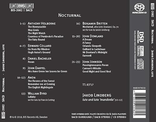 Beautiful playing, sound, and music. I think I prefer Britten's "Nocturnal" on guitar even though his first thought was to write it for the lute. Still, Lindberg plays it wonderfully, and it must be terribly difficult on the lute.