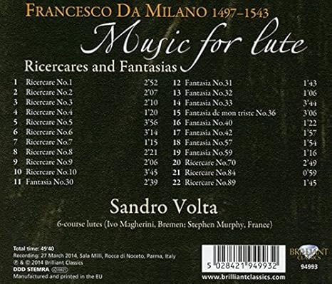 The most striking thing when you hear it is his lute, which has hardly any reverberation. Notes don't last long. He plays quickly and with dancing rhythms. The result is a extrovert, joyful and rather simple.